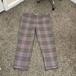 Good condition no stains rips or fading. Some slight pilling in the crotch that isn’t very visible even when inspecting closely but it feels a rough. Relaxed, tapered fit, menswear inspired cropped pants. Zipper and button closure. Slight stretch. Polyester and spandex blend. Beige, black, pink, orange and blue plaid print.