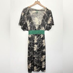 Anthropologie Maple 100% Silk Kimono Style Dress Sz S Leaf Print With Green Sash