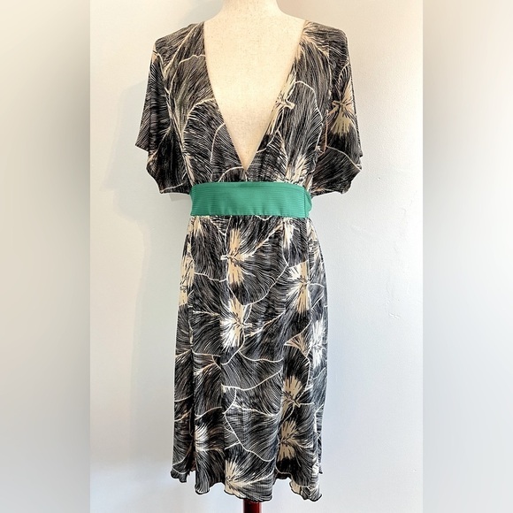 Anthropologie Maple 100% Silk Kimono Style Dress Sz S Leaf Print With Green Sash