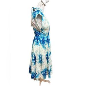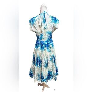 Beautiful retro 1950s inspired, fit and flare silhouette dress. Blue hydrangea flowers are scattered on a white background. The skirt is pleated and flares out to more than a full circle. Made from soft and draping 100% cotton. Side pockets. Invisible back zipper. Cotton lined bodice. Mid-calf length. Originally sold at Anthropologie, tagged as made by Maple. Hand wash. Tagged as a size 4.