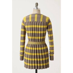 Yellow/brown striped cardigan from Anthropologie's Maple. Ribbed knit. Contrasting stripe belt at waist. Two front pockets. Hook & eye closure at neck.