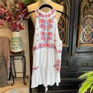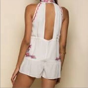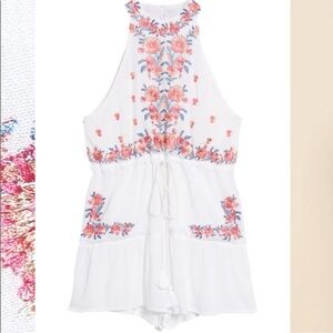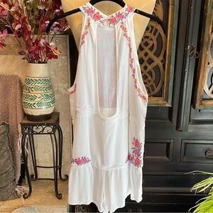 Anthropologie Raga Mariah Festival Boho Floral Embroidered KeyHole Open Back Romper. Side drop. Very loose fit. Drawstring waist