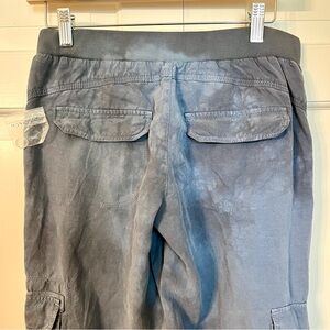 The Julia cargo capri has a relaxed fit that you'll love to wear on-the-go. The stretch ribbing at the waist adds extra comfort and the oversized cargo pockets are roomy. This is a subtle tie dye combo of lake blue and cruise. Soft tencel and linen blend.