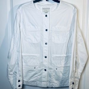 Anthropologie Marrakech White Cotton Jacket, NWT, Size Medium, Button-Front with cinch-able waist (photo5). Double-button cuffs. Great light-weight Jacket goes great with jeans.