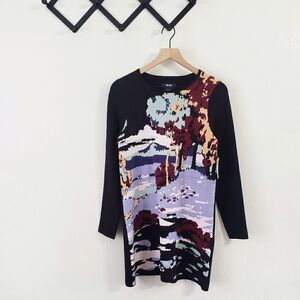 Take the sartorial scenic route in this mini dress, where a soft, sweater-knit finish and a painterly motif effortlessly fuse comfort and charm.