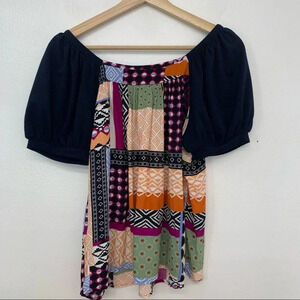 Patchwork Print Short Puff Sleeves Boho Lightweight