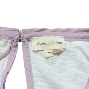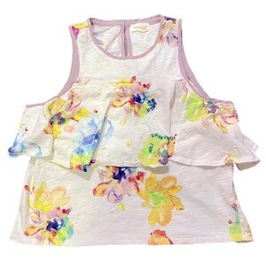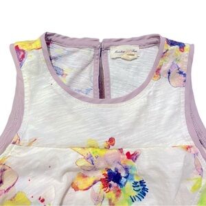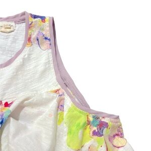 Women's Small Anthropologie Meadow Rue Cantara Printed Layered Cotton Tank Top. White shirt with multicolor floral design including green, pink, purple, yellow, and orange. Unique raised stitching design on some flowers. Keyhole back. Lavender sleeve and neck outline. Retails for $68.
