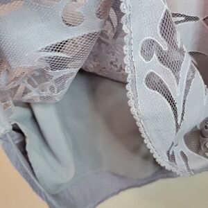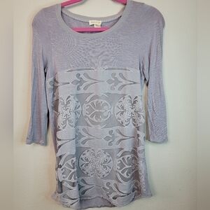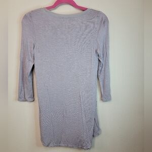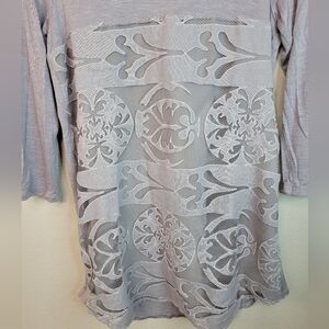 Like new condition! Beautiful lace Eyelet design with a lined front. Detailed from top to bottom with feminine touches. Lavender lilac ash color. Size XS. Bust 33 and length 29.5 Soft three quarter sleeves.