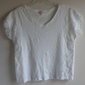 Anthropologie Meadow Rue white v-neck boxy tee with eyelash lace trimmed sleeves and lace panels on both sides.