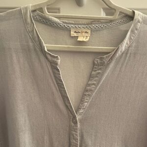 This light blue mesh lace button front sheer shirt is by Anthropologie’s Meadow Rue. This top would be so nice paired over a camo. The front and back bottom hem has embroidery accents.