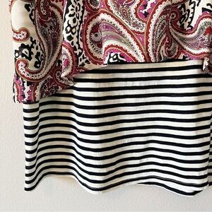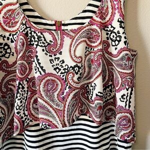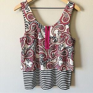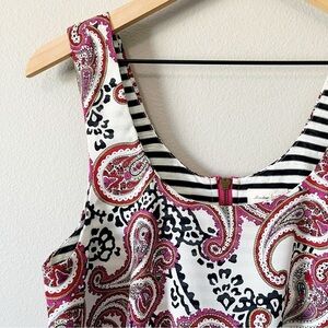 Meadow Rue for Anthropologie paisley and striped layered tank top. Size medium. White, black, and pink. Scoop neck. Zipper closure at back. Pre-owned, excellent used condition- one small snag on back of strap + writing on interior care tag (see photos).
