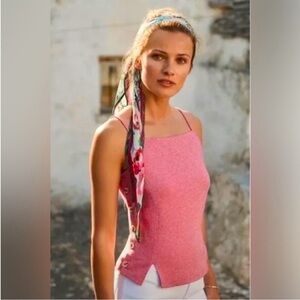 The sleeveless top features a square neckline and spaghetti straps with side buttons and a pullover closure. It comes in a beautiful pink color and is made of a comfortable blend of polyamide and cotton, with accents that include spaghetti straps, buttons, and side buttons.