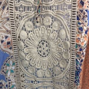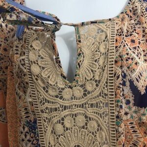 orange, blue, tan, teal and purple,Crocheted detailing down front and arm pits,Bow and tie at neck with keyhole, missing sizing and material tag, polyester?,Please see all pictures for measurements for sizing,