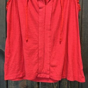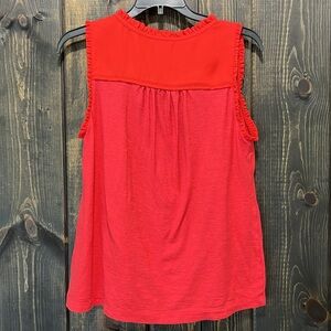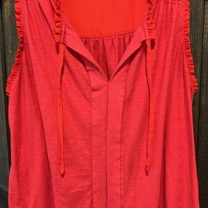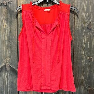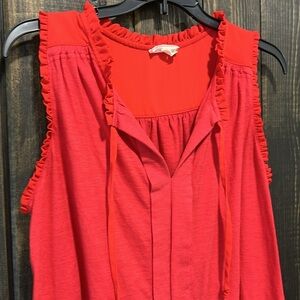 Anthro brand Meadow Rue sleeveless blouse. Size small. Red. Tie front. Ruffle trim. Neutral. Light feel knit. Versatile. Dress up or down. Preloved. Please see all photos for condition.
