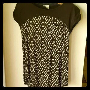 Color / Design: Black, t-shirt like neckline and sleeves with contrasting flowing body of black and white.diamond shape and cross print.  100% cotton. Machine wash cold. Lay flat to dry.