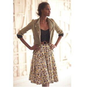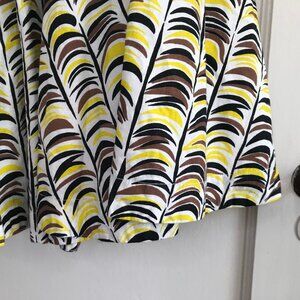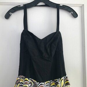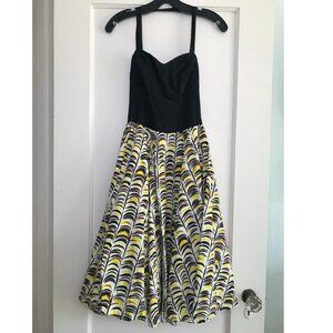 Vintage retro-style dress from Girls from Savoy (via Anthropologie). The dress features a black halter top with ruched stretchy material in back side panels for a comfortable snug fit and a fit-flare full circle skirt in a vibrant feathers pattern. The dress can be worn with or without the adjustable halter strap (removable). Covered back zip with hook & eye closure. Built in petticoat helps give the skirt its volume.