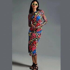 Anthropologie Mesh Halter High Neck Dress Floral Bodycon Midi Colorful