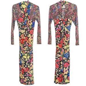 Features: long sleeves, criss-cross halter mock neck, sheer mesh bodice and sleeves, keyhole back with 2 button closure, ruched skirt, side slit, midi length