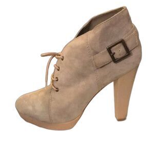 Anthropologie Messeca NEW YORK Women's Bobbie Suede Lace -up platform heeled booties. Mushroom suede. tie up bootie. 5inch platform. Size 10. great preloved condition.