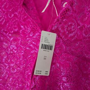 Vibrant Barbie pink with sparkly fun. Back pleat and slightly longer in back. Classy, comfortable, feminine.