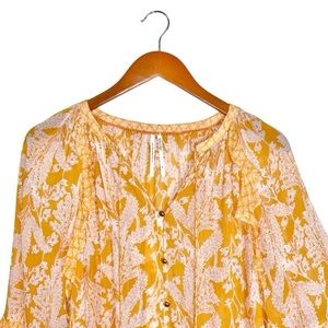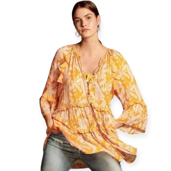 Anthropologie Mia Tiered 3/4 Sleeve Button Front Yellow Floral Ruffled Tunic Top