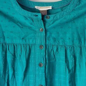 The Mila Draped Buttondown Blouse top from Pilcro Letterpress by Anthropologie. Color is turquoise (looks a bit more on the green side to me). Long sleeve, loose and flattering fit. Longer in the back. Great with leggings or jeans. New with tags.
