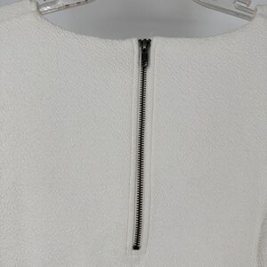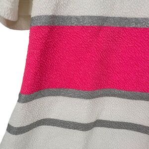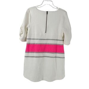 Anthropologie Mini Dress Deletta White With Pink & Silver Metallic Silver Striping Ruched Sleeves V Neck Textured Stretch Material With Exposed Back Zipper Preppy