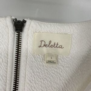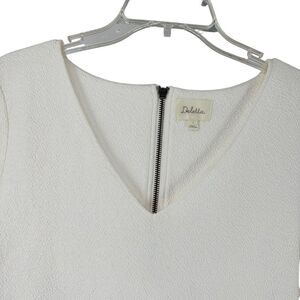 Anthropologie Mini Dress Deletta White Pink Silver Ruched Size L V Neck Stretch