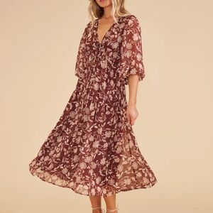 This stunning Mink Pink dress is absolutely perfect for fall! The rich rust and burgundy tones with delicate floral details are giving me all the autumn vibes.