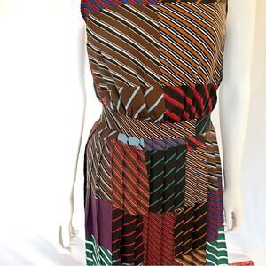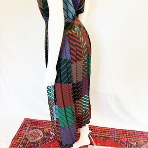 Patchwork pleated style. Mockneck. Buttons at the neck. Midi length. Rich jewel-toned colors including red, brown, purple, blue.