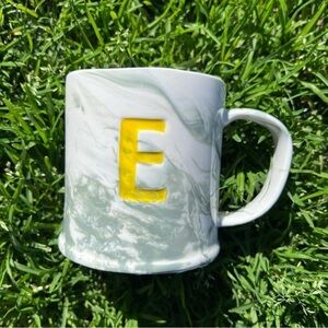 Anthropologie Monogram Letter E Coffee Tea Mug. White with a Green/Gray marble pattern and a bold Yellow “E”. Mug feels substantial in your hand. Uneven/wavy rim gives the character of hand thrown pottery. Never used, ordered online so it won’t have an Anthro tag.