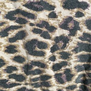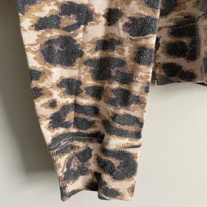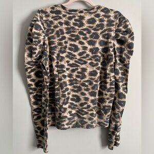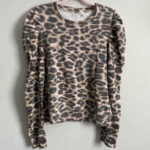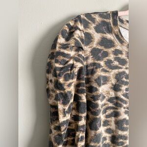 This Anthropologie sweater by Moth is so cute. It is an animal print pattern in shades of brown and black with a touch of pink. It has a puff to the shoulders of the sleeves.