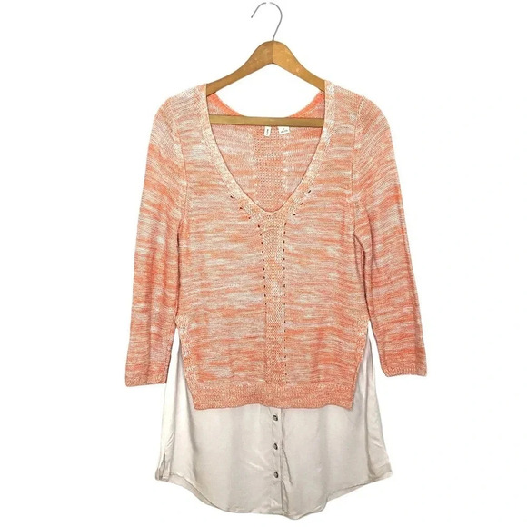 Anthropologie Moth Aselin top, layered look blouse, sweater with shirt hem, Anthropologie knit blouse, peach pink top, casual office wear, boho Anthropologie style, layered sweater medium