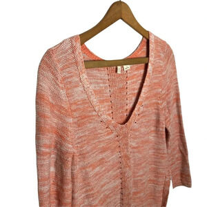 Effortless Anthropologie style: this Moth “Aselin” sweater top combines a cozy knit with a chic layered look. The peach-pink marled knit features an open V-neck and 3/4 sleeves, while the lightweight woven underlay creates the illusion of a layered button-down blouse without the bulk. A versatile piece that works for both casual days and polished office wear.