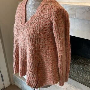 Tan & Peach Chunky boucle knit v-neck sweater with a single zipper on the bottom left side. 43% Cotton/21% Wool/20% Nylon/13% Acrylic/3% Alpaca. Hand wash cold separately. Do not wring or twist. Non chlorine bleach. Reshape & lay flat to dry. May be dry cleaned. Imported. Size Small. Approximate measurements laid flat: 22.5” long. Shoulders 13.5”. Armpit to Armpit 20”. Midsection 21”. Across bottom 20”. Sleeves 24” long. Excellent Used Condition with no Flaws. Smoke & Pet Free Home. Shipping Same Day or Next! Bundle & Save!