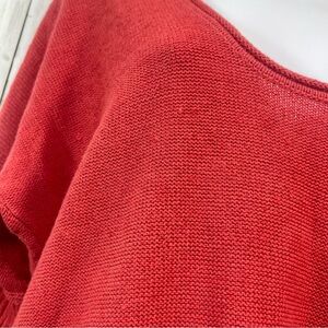Reddish orange, linen blend, scoop neck, 3/4 sleeves, wide ribbed waistband, side slits, extra thread in case you need to mend, ribbed trimming, colors may vary due to lighting, good used condition, Small, style 684936382