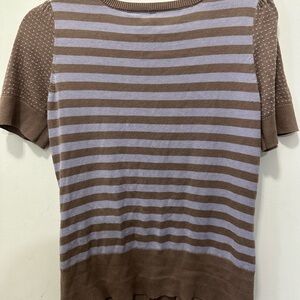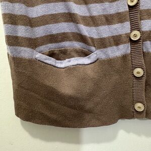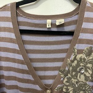 Cute brown/purple cardigan with short sleeves with flower appliqué on left side chest. Beige pearlized buttons, bottom pockets and v-neckline. In perfect condition.