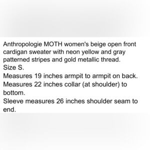 Anthropologie Moth Chaux Stripe Shimmer Open Cardigan Pre-owned - good condition Beige, yellow/green, & gray striped pattern, shimmer gold metallic thread throughout Knit open front Has pockets Cotton & other fibers blend