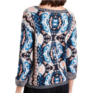Anthropologie Moth Cabine Blue & Peach Kaleidoscope Print Knit Sweater Blue, pastel peach pink, gray, navy blue, and white kaleidoscope pattern Striped neckline and hemline 3/4 turn up cuffed sleeves Slightly cropped 78% cotton 7% modal 7% triexta 6% viscose Bust pit to pit - 19.5” Length - 24”
