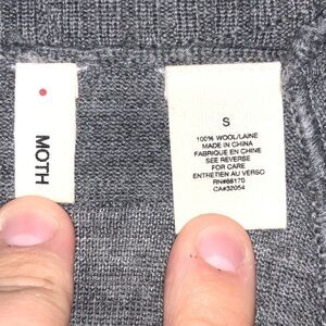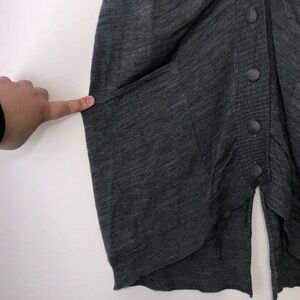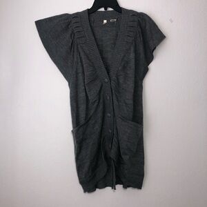 Anthropologie Moth 100% Wool flutter / butterfly cap sleeve cardigan; button Up. Color is slightly marled charcoal gray. Long fit. Deep V style with ribbed collar. Split back detail. Large front pockets on both sides. Ultimate slouchy cardigan. Excellent preowned condition. No stains, rips or holes. Smoke free home.