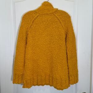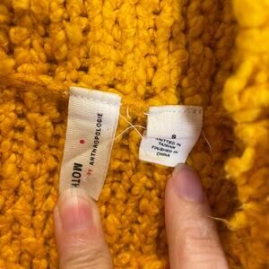 Mango (golden yellow) Juliette pullover sweater by Moth from Anthropologie. Featuring a turtleneck collar, long sleeves, a nubby texture, and small slits on the sides. Cotton blend. Very good pre-owned condition. Bust across the front area measures approx. 18 inches (unstretched).