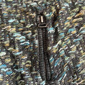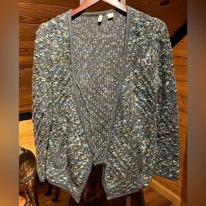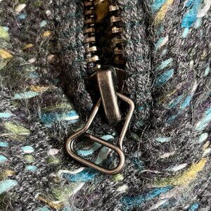 Elevate your wardrobe with this trendy Anthropologie Moth Keavy Chunky Open Cardigan. This beautiful cardigan has a charcoal gray background with a multi green hued thick stitch pattern make it perfect for any occasion, from casual outings to business meetings or even parties. The long sleeves and front zip pockets add both style and functionality to the sweater. This wool blend cardigan is designed to keep you warm and cozy during colder days. It's easy to care for, just hand wash only. The open front makes it ideal for layering and the chunky cable knit adds a touch of texture and luxury to your outfit. Don't miss out on this must-have sweater that will easily become a staple in your wardrobe.