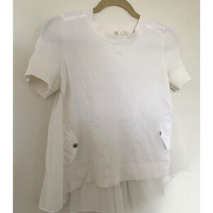 Anthropologie Moth top with a mixed media knit and chiffon blend. Features short sleeves, crewneck, faux front pockets, and pleated back for soft structure. The high-low hem adds dimension, perfect for layering or standalone wear with trousers or denim.