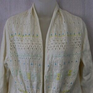 This Anthropologie cardigan is a rare, whimsical piece perfect for springtime layering. Featuring delicate lace detailing and tiny blue and yellow embellishments, it evokes soft, feminine charm reminiscent of Easter or a sunny garden brunch. The lightweight linen blend drapes beautifully, making it ideal for pairing with dresses, skirts, or casual jeans for a romantic, vintage-inspired look. Its subtle pastel tones and intricate design make it a standout statement piece for seasonal wardrobes or collector enthusiasts seeking unique Anthropologie finds.