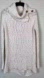 Lovely nubby boucle open knit pull over sweater in cream with large split cowl neck. Three wooden buttons detail on cowl, long sleeves, tunic length. Cable knit down front length of sweater. Ribbed knit collar, cuffs and hem. Raglan sleeves, high low hem. Spare button and thread included. Wrap yourself up in this soft and cozy sweater!