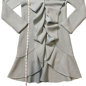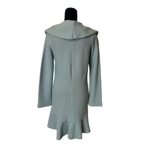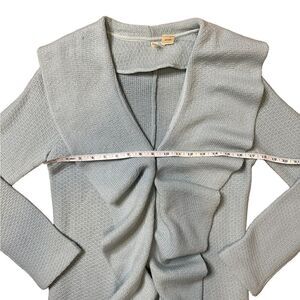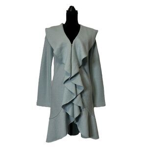 Anthropologie Moth Ruffle Front Merino Wool Cardigan. Beautiful cottage core cardigan featuring ruffle detailing. Eye hook closure front. Long sleeves. Draped fit. Color is a dusty baby blue. Merino wool. Dry clean.