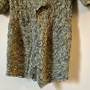 This beautiful knit sweater from Anthropologie features unique coloring and a single large button closure.