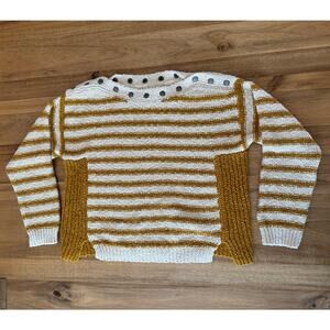Anthropologie Moth striped knit pullover sweater in cream with a mustard yellow brown stripe and contrast side panel detail.