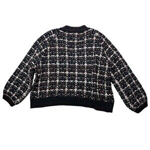 Preowned Anthropologie Moth cardigan sweater Women's size large. White black red colors. Checkered pattern. Knit. Dropped shoulders. Wooden looking buttons. V neck. Thick. Preppy Classic.