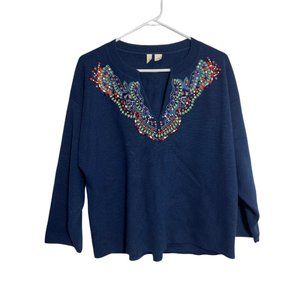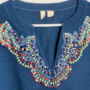 Anthropologie Moth V-Neck Navy Jewel Embellished Sweater Women's Size Medium